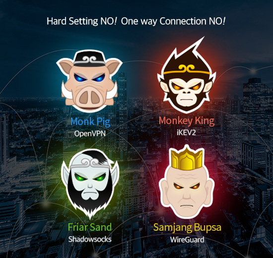iKEV2, OpenVPN, Shadowsocks, and Samjang Bupsa. Supports 4 different modes of connection,